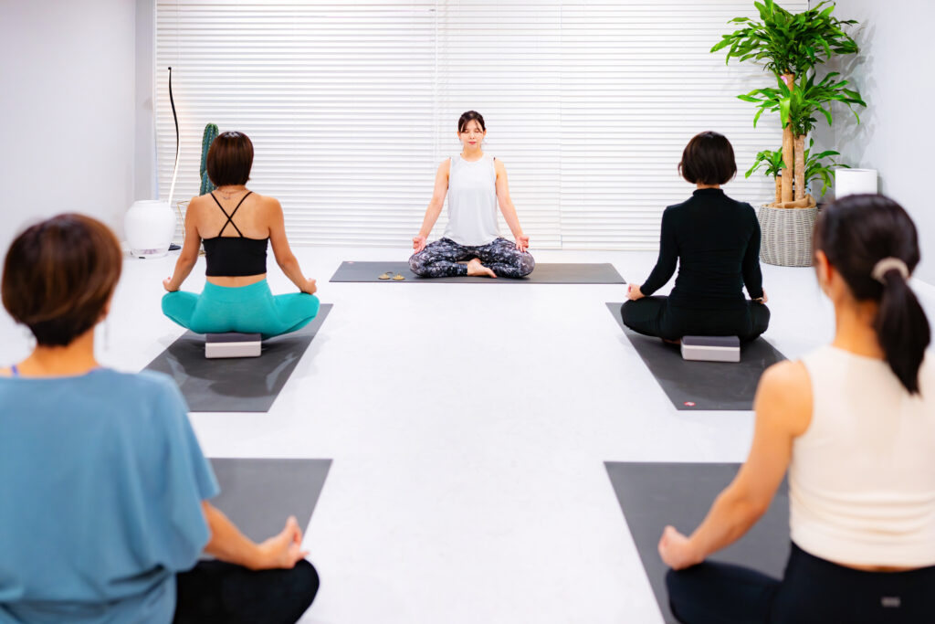 通常レッスンの中で、会員様と一緒に同じ内容でご受講していただきます。ウォーミングアップから始まり、基本の呼吸法やポーズへとレッスンを進めます。初心者の方でも楽しんでいただけるよう、インストラクターが丁寧にご指導いたしますので体験の方もご安心ください。